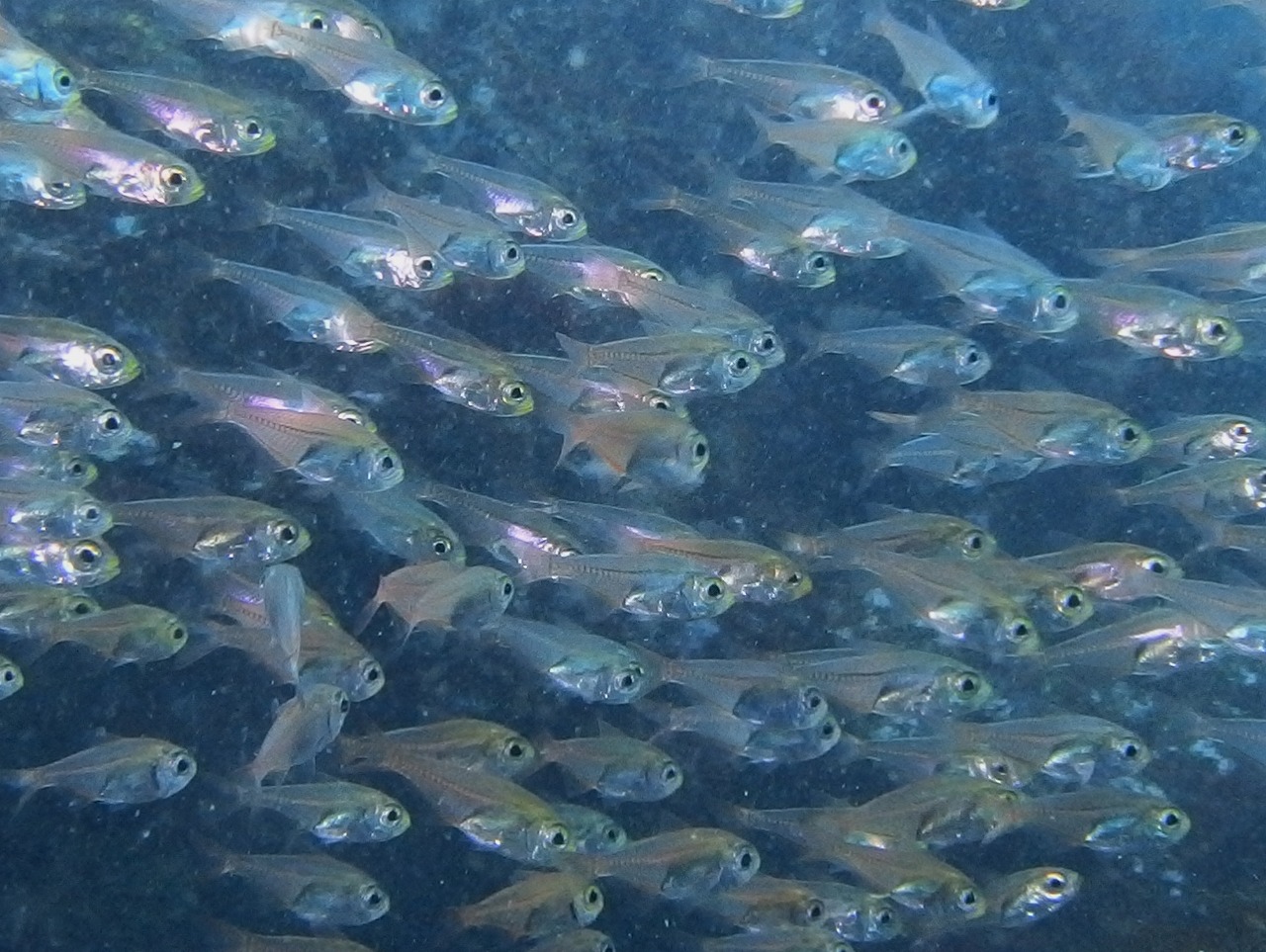 キビナゴの群れ、クロホシイシモチの群れ、サクラダイ、キンギョハナダイ、スジハナダイ、ナガハナダイ、