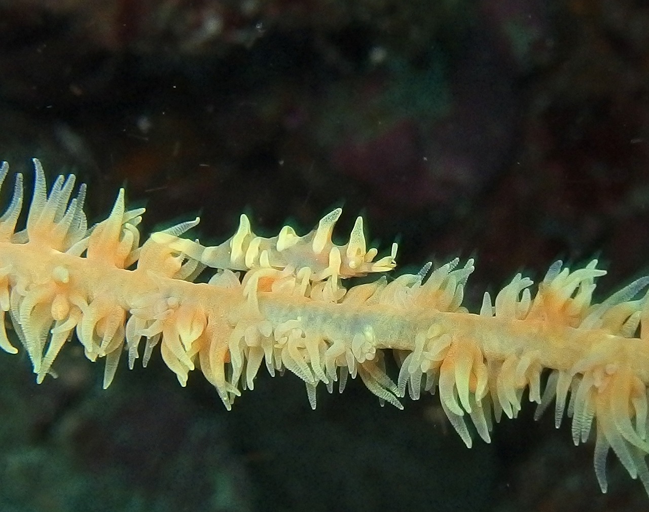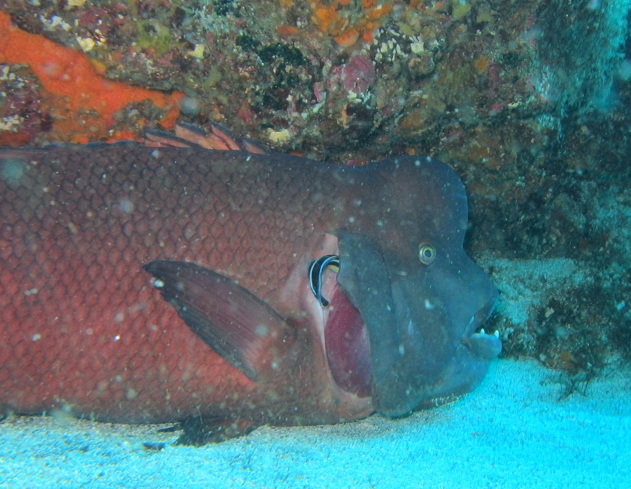 さて、今日はリクエストで5番のソウシを見に行ってきました。前回見たのが2週間前だったのでまだ居るかもわからずでした。エントリーしてみると濁りが戻ってしまいましたかね。5~8m程度でしょうか。かなりしらっちゃけていました。遠征にはぎりぎりの透視度ですね。そんななか、行ってきたわけですがちゃんと居てくれました。しかもペアで!!相変わらずの威圧感でした。午後は1の根周りを回ってきましたがここへきてベニカエルが多く出てきています。今日はさらっと見て行って3個体確認できました。まだまだ居るようです。そしてその傍らではコブダイが気持ちよさそうにクリーニングされていました。ヒレ全開ならぬエラ全開でした・・・。クエ穴では久しぶりに巨大クロアナゴが鎮座していました。こちらも威圧的です。他にもイガグリやシモダイロなどのウミウシ、ビシャモンエビなど小さいものもちゃんと見てきました~。濁っていてもかなり面白い海ですよ~。