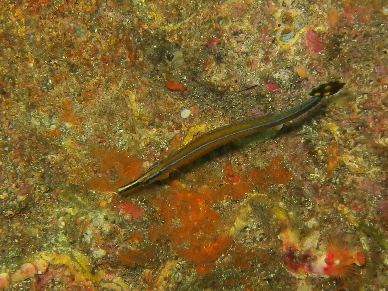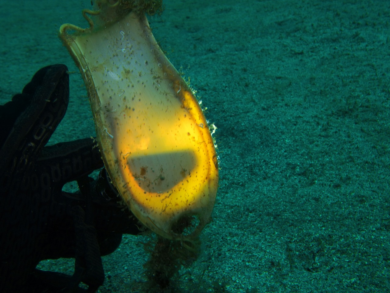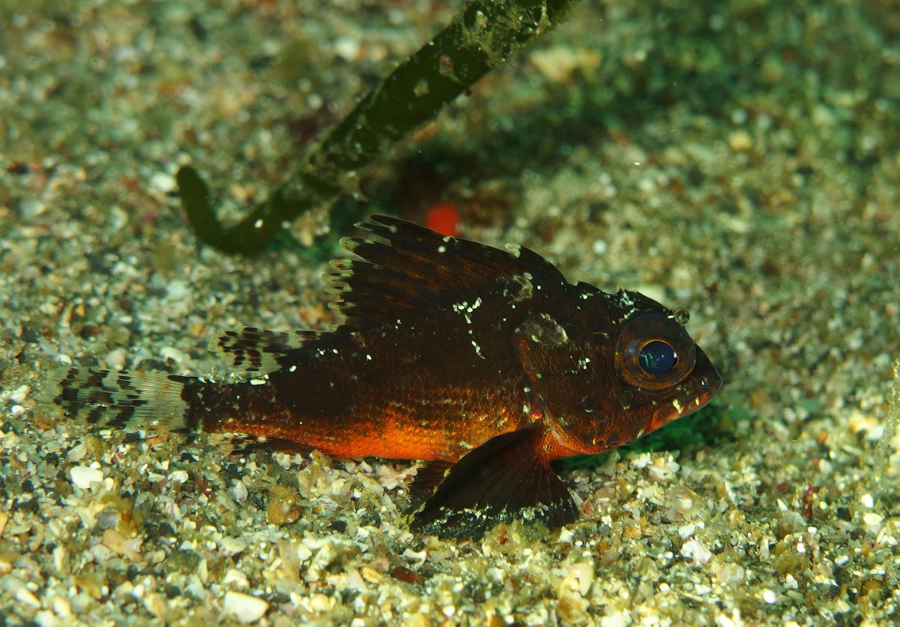 水中はやはりこちらも浅場が緑がかっていて浮遊物も出て来てますね。それでも10m弱は見えてるので良しとしましょう。そして15mを越えたあたりからきれいな水が来ていますね。青いです。さて、今日は砂地メインで回ってきました。以前見られたダンゴウオは消えてしまったようでしたがスナビクニンが代わりに(?)見られました。緑色の小さい個体でした。乗ってるのも緑の海藻だったので見にくいこと見にくいこと・・・。でも久しぶりに見れて良かった~。聞いていた場所とは全く違うところで見れたのでそれなりに個体数は居るかもしれませんね。そして、その付近ではヒレナガカサゴが登場。これはやばかったですねぇ。砂地にちょこんと見るに隠れるようにしてじっとしていました。大きな目とヒレがいいですねぇ。ヨコバマは久しぶりでしたがやっぱり生物も多く楽しいですね。