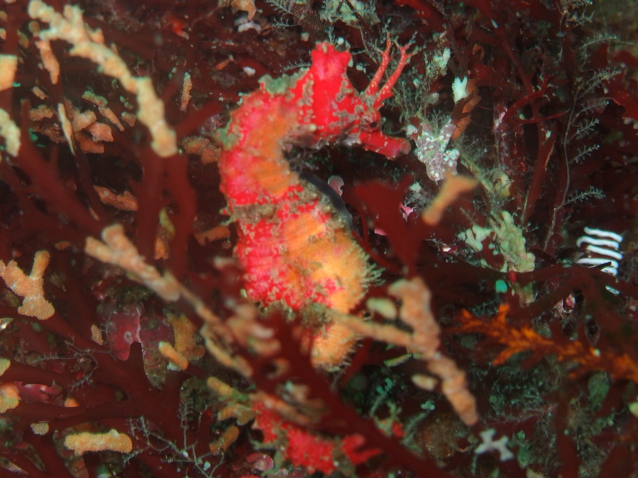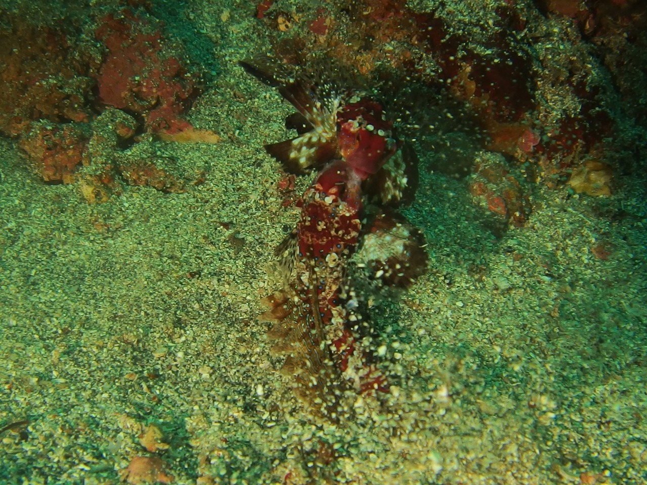 透視度は、浅場が5mちょっとで少し降りて行ってもそれほど変わらず10mぐらい。20mを越えたあ たりから青く抜けていきます。冷たい潮が来ていますね。この潮も時間によって動くので浅いところに来ることもありますね。でもそんなときは目をマクロにし てみていくといろいろ楽しめます。砂地ではセンターで情報を頂いた小さなウミテングが確認できました。ちょっと中層を見ているとキビナゴがすごかったです ね。更に大きなブリの群れがキビナゴを追い回していました。ちょっと暗かったので写真は微妙ですが・・・。大迫力でした。また、ヤマドリの喧嘩も迫力あり ましたね。結構長い時間戦っていました。最後まで見届けたかったのですが残念ながら時間切れとなってしまいました。どっちが勝ったかなぁ。べ二も相変わら ず祭り状態。各所でそれぞれペアで見れていますね。さて、明日ですがIOP肉BBQとマリンダイビング「とるのるフォト」イベントです!!楽しみです~。 そして、あさって日曜日はガラガラです~(笑)来てください~。