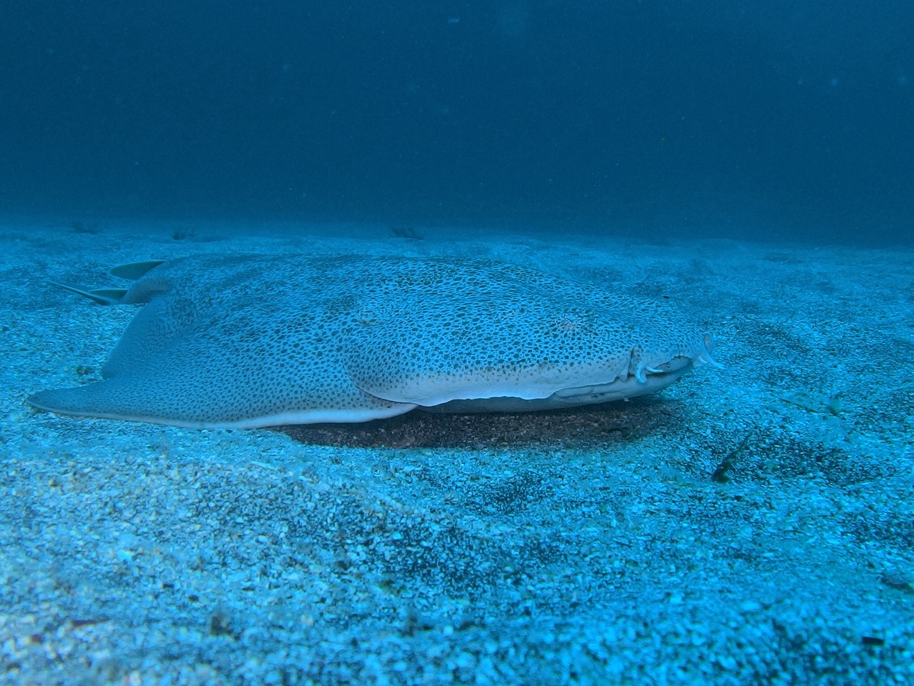 かけ上がりのネンブツダイやオキタナゴの群れがすごいことになっています。水もそこそこ綺麗なのでこの群れはいいですね。砂地のウミウテングも2個体健在でした。また、カスザメやサカタザメは今日も登場してくれました。やはり砂地は熱いですねぇ。しかし、根回りもかなりすごいことになっています。産卵期のベニカエルは今日も6個体確認できました。先日より居ついているテングダイも無事確認できました。この深度で見れるのがお得感があります。写真のウミウシはハナイロウミウシのようで初見のウミウウシでした。綺麗なウミウシです。そして、ようやく確認できたのがハナタツの赤ちゃん。周りに溶け込んでいてなかなか見つけにくかったですね。今日ようやく見ることが出来ました。小さいのに目がくりくりしています。やばすぎですねぇ。他にもツマグロハタンポの赤ちゃんやオキナワスズメダイの赤ちゃんなども出ていて見どころ満載となっています。やばい海ですよ~。
