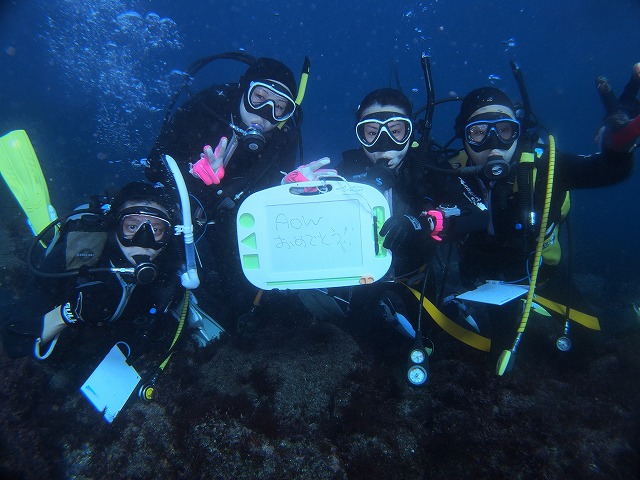 ご参加の講習生の方々は先月OWを取得してからお友達を誘ってきてくれました。みなさんとても上手でばっちり中性浮力をとって泳いでいましたね。小さなキタマクラの子供に感動したりポストへはがき投函したりと海洋公園を満喫していました。みなさんアドバンス認定おめでとうございます~。そして、海況ですが透視度が上がりましたね。今日は20mは見えていました。だんだんと浮遊物もなくなってきてきれいになってきますね。いい海です。今日で連休も終了しましたがこの間にたくさんの方々にご参加いただきました。たくさん潜ってたくさん飲んで楽しい3日間でした。ご参加いただいた方々ありがとうございました~。