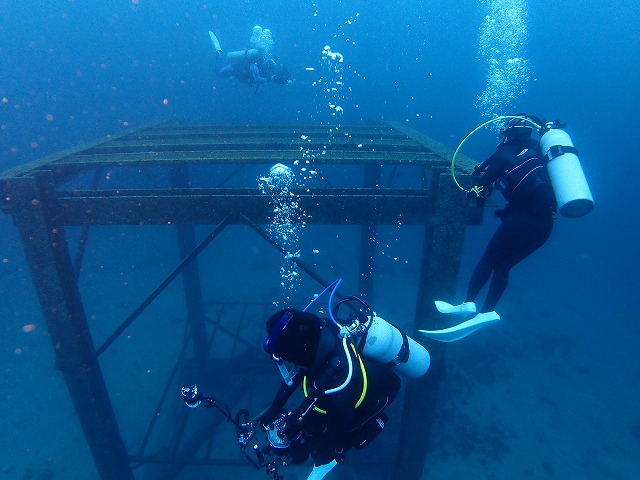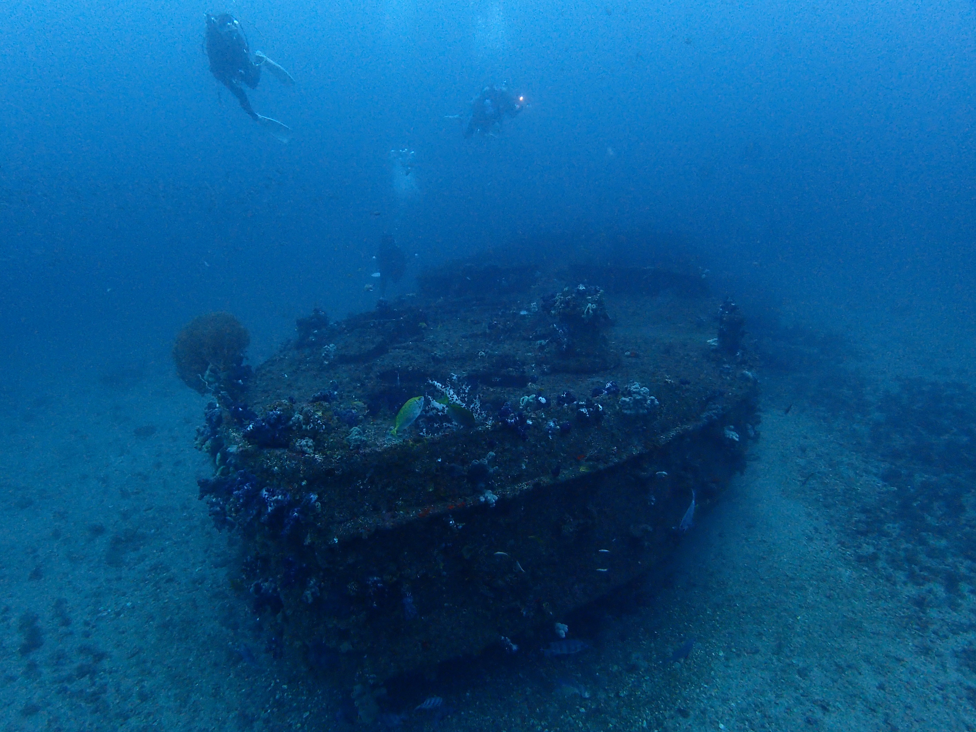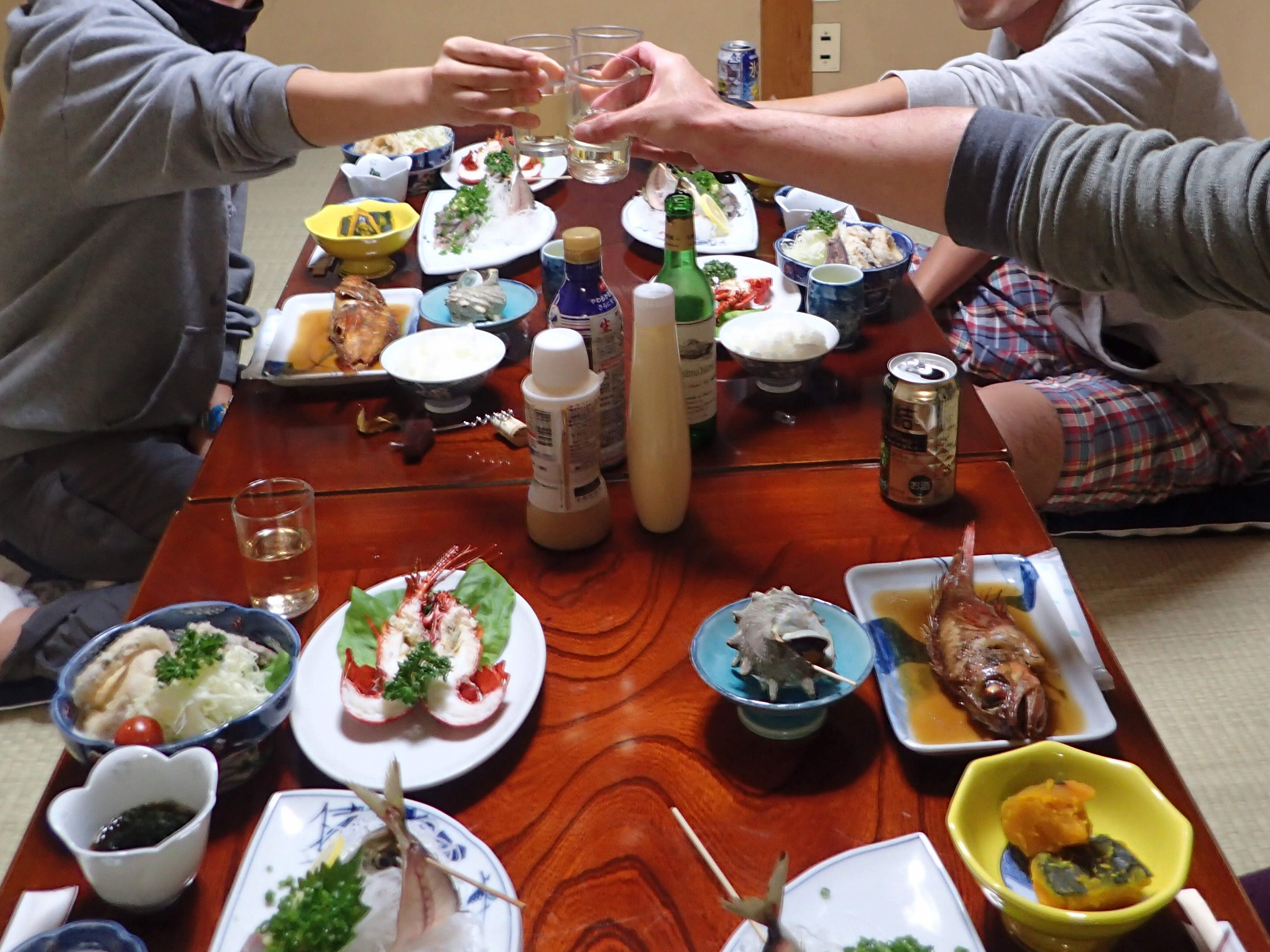 さて、ダイビングですが基本ビーチダイビングでセンター前からのエントリーになります。2日間とも風の影響で少しバシャバシャしていましたが潜るには全く問題ない感じでした。透視度も割と良い感じでしたね。20m位は見えていると感じました。初日は遠出してやぐら2.5というポイントに行ってきました。ここは砂地に巨大なやぐらがありそこに様々な魚がつくところです。さらにその奥には沈船があります。これはぐっと来ますねぇ。ビーチからの沈船なんて・・・。午後は近場をじっくり回りましたがシロクマやカミソリなども見られましたね。そして、圧巻なのがタカベの群れです。もはや川という感じで群れています。2日間とも常に頭上で群れていましたねぇ。これはなかなかないですね。すごかったです。タカベリバーです。そんな興奮も冷めないうちにアフターダイブは温泉「島の湯」へ。気持ちよかったですね。その後は豪華な夕食からの宴となりました。楽しい宴でしたねぇ。