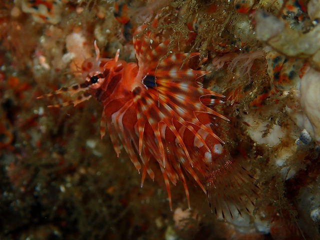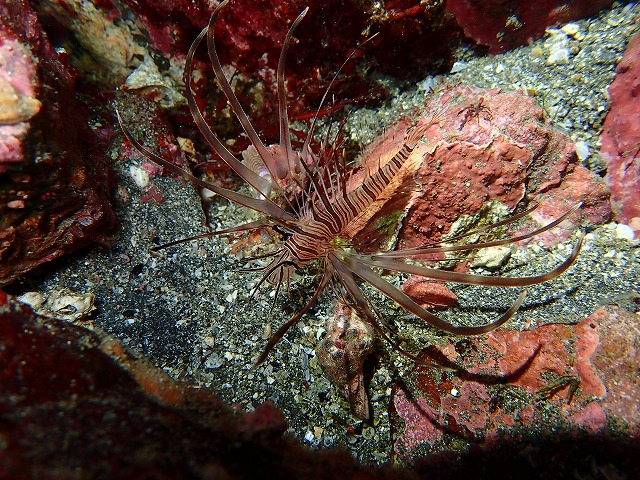 こちらは若干のうねりはあるものの穏やかで平和でしたね。透視度も良かったのですが天気がこんなだったのでかなり暗かったですね。透視度自体は20m位はありました。水も青かったですね。根周りでは復活したというフリソデを見てきました。比較的大きい個体で写真も撮りやすかったです。その近くにはベニやクリアクリーナーシュリンプ、ハナミノカサゴの子供なども居て何気に熱いエリアとなっていました。その他のエリアでもカミソリやキリンミノ、ホシテンスなどネタも豊富な八幡野でした。
