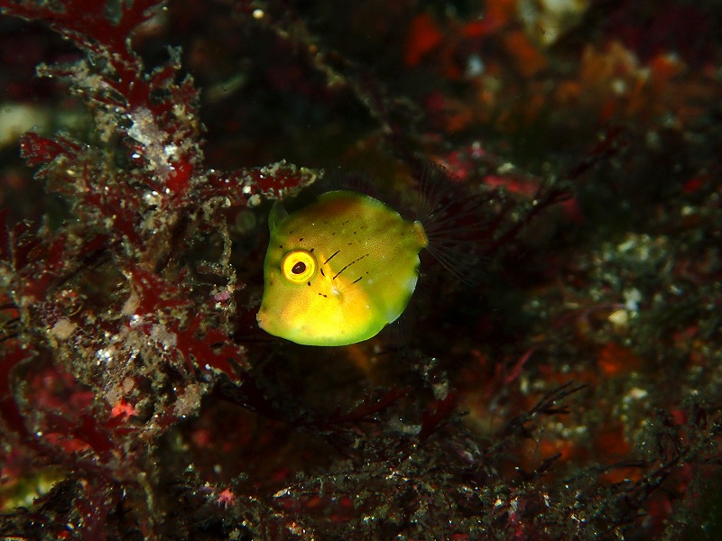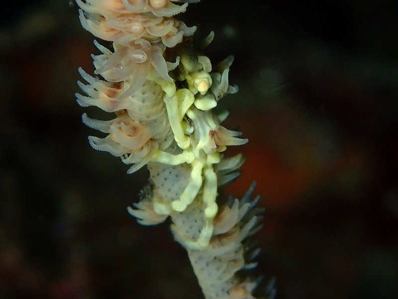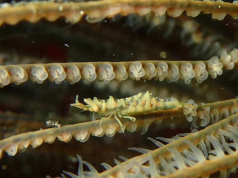 透視度が少し下がっています。浮遊物がちょっと多くなってきましたかね。10mほどの透視度でした。明るいのでそれほど暗い感じはありませんが・・・。今日は近場をじっくり回ってきました。シテンヤッコやサザナミヤッコがまだ頑張っていますね。フリソデもまだ見れていますしその周辺にはイボイソバナガニやウミカラマツエビなどが見られました。どちらも極小です。少しづつ水温も下がってきていますがまだまだ17℃台。快適ですね。