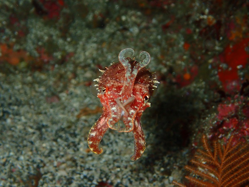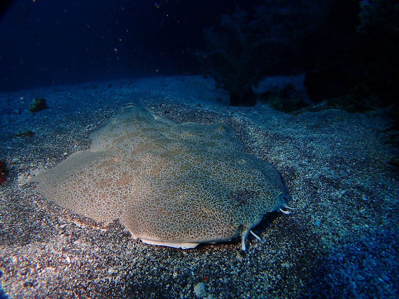 ただ、透視度がまた戻ってしまいましたね。かなり白っ茶けた感じで10m弱な感じです。この天気なので暗かったですねぇ。先日見つからなかったクロクマは今日は定位置で確認できました。良かった~。その周りのキンギョの群れも圧巻ですね。スジハナダイなんかも婚姻色とか出ててきれいでした。クエ穴では大きなクエも確認できました。ここ最近はよく見れていますね。砂地ではカスザメも登場。いつもの個体でした~。識別できると親近感がわきますね(笑)