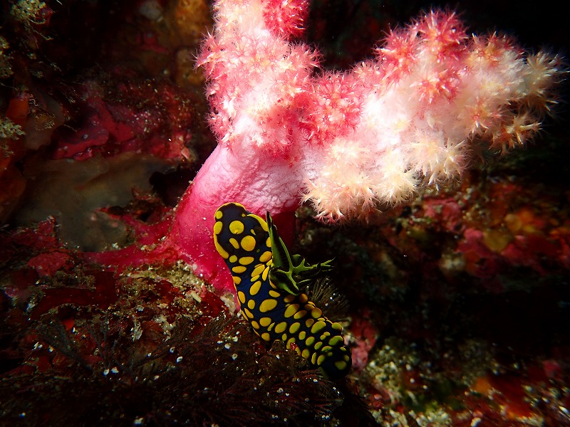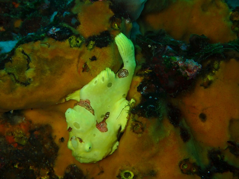 相 変わらず干潮時は水がなくなりますが、問題なかったですね。透視度も変わらず下の方は抜けていますね。午後にはこのきれいな潮がだんだん浅場に上がってき た感じでした。さて、今日はブリマチからクエ穴まで広々と回ってきました。ブリマチではイロカエルを確認してきました。その近くにはおなかの膨れたベニカ エルも居ました。食事後だったですかね~。また、このエリアはキンギョハナダイの群れがすごいです。メガ群れでした。そして、そのうえではタカベも大きな 群れをつくっていました。クエ穴周辺ではサガミリュウグウやイガグリなどのウミウシが見られます。かけ上がりではクロホシイシモチがペアになってきまし た。ネンブツダイも産卵行動が出始めています。そろそろ、この辺りが面白くなってきそうですね。産卵行動と言えば今月25日はサンセットダイブの日です。 19時が最終エキジットとなりますのでヤマドリなどの産卵もばっちりです!ぜひご参加ください~。
