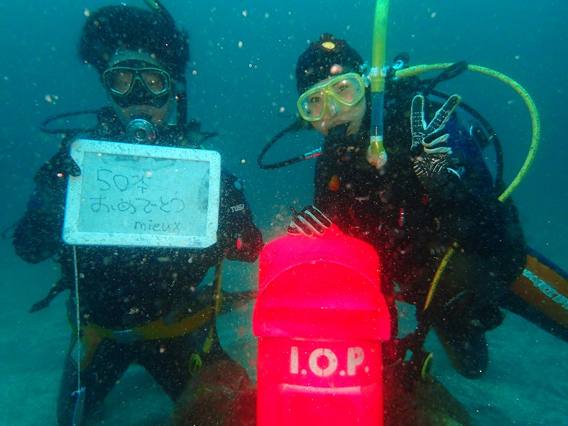 浅場が8m、深場が5m位ですね。明日以降に期待しましょう。わりと明るめなので入江のキビナゴやタカベの群れがきれいですね。いい感じです。近くのマツバギンポも相変わらず良く動いています。砂地では黄金ヒラメがカップルになっていました。寄り添うように重ねあっている2匹でした~。ホウボウ赤ちゃんも今日も無事に確認できました。相変わらず小さくてかわいいですね~。さて、そんな中今日ご参加のゲスト様がめでたく50本を迎えました!!おめでとうございます~。ポストと記念写真撮ってみました!!100本目指して潜っていきましょう!!さて、GWが週末より始まります。まだ空きがありますのでぜひお越しください。ネタも多くて面白い海ですよ~。お待ちしています!!