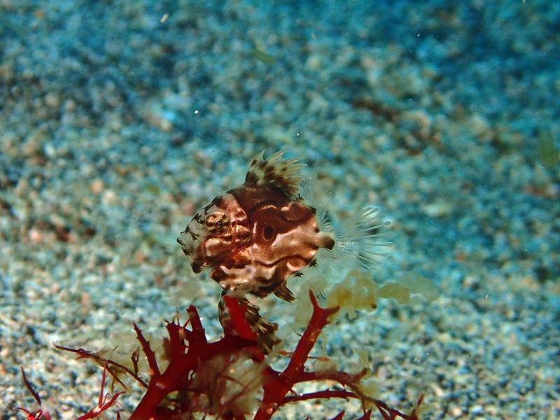 透視度の方は浅場はいつもと変わらず10m位見えています。砂地などの深場に行くとちょっともやっとしていて15mほどでした。こんなに良いコンディションだったので元気に3ダイブ潜り倒してきました。昨日無事に確認できたマトウダイの赤ちゃんは今日は移動していて少し離れたところで見つかりました。小さくてかわいいです。明日もいてほしいですね~。そして、極小のミアミラも定位置で見れました。根周りではいつものカエルアンコウたちやハナタツを見てきました。そして、3本目には浅場をのんびり2番まで行ってきました。根の上ではイサキとキンギョハナダイがものすごい事になっていました。特にイサキは今季最大の群れっぷりで軽く巻かれてきました。また、そのエリアだけ水が青い事青い事。それなりの水温でしたがIOPブルーでしたね。このエリアの下の方や1.5番の方ではなにやらやばいのが登場しているそうでかなり気になりますね~。それにしても天気も良いし海況も最高にいいし言うことないですね。こんな日に潜らないともったいないですね。ぜひぜひ潜りに来てください。お待ちしています。
