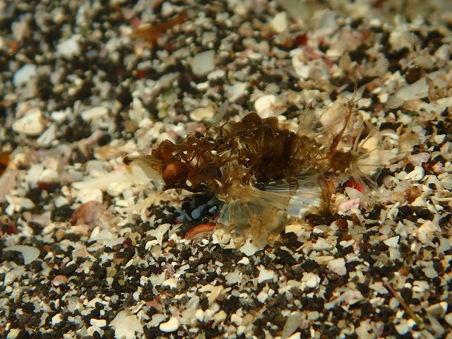 さて、昨日までの講習も無事に終わり今日は久しぶりに深場へ行ってきました。狙いはバルスだったのですが最近いなくなっているようでした。行ってみると噂通りいなくなっていて代わりにミズヒキガニがついていました・・・。そのまま砂地をズリズリしているとかわいいウミテングが見られました。こうなると2本目の目的地は決まってきます。またまた泳いで5番のオキスジを見に行ってきました。こちらはしっかりといてくれるので助かりますね。今日もワラワラといました。そして3本目は近場を回ってきましたがベニカエルやもう7月だというのにまだ居るホウボウの赤ちゃんなどが見られましたね。エキジット間際の超浅場ではミナミハコフグの赤ちゃんやカゴカキダイの赤ちゃんなども見られました。海況も良かったのでがっつりと3ダイブ潜り倒してきました~。