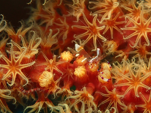 うっすらうねりはありましたが全く問題なかったですね。水中も少し白っぽい感じですが十分青くて綺麗でした。天気も良かったので浅場が特に綺麗でしたね~。深場はしっかりと冷たい潮が入っていましたがこちらも綺麗でしたね。気持ちよく泳いでいるといたるところでキビナゴが群れて居てキラキラしています。そこへいつものカンパチ軍団が突っ込んできました。迫力ありますね~。入江ではタスキモンガラが台風の時化にも耐えて元気にしていました。良かった~。メガネスズメダイも元気でした!!あとは新たな南方種の登場を期待しましょう~。