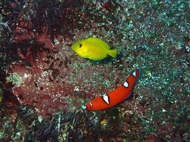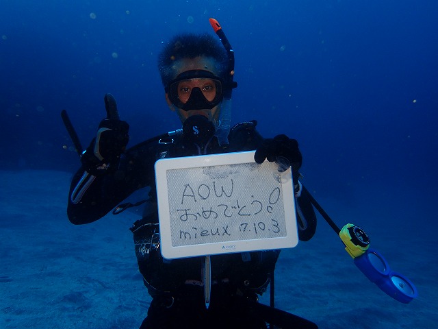風波がいい感じで入っていましたがタイミングを見て出入りすれば問題なかったですね。水中も浅場はさすがに揺れていますが降りてしまえば揺れも少なく快適でした。透視度も良いですね。今日も15mは見えていてとても青かったです。入江ではナミノハナが水面近くに群れて居てとても綺麗でした。イロやベニも定位置で見られます。鉄板ネタですね。イサキの群れも綺麗でしたね~。そんな中今日はAOW講習の2日目でした。さすがに連続で潜っているので今日はとてもきれいに泳いでいました。写真もたくさん撮ってましたね~。TさんAOW認定おめでとうございます~。これからマイドライスーツでガンガン潜りましょう~。今週末の3連休まだまだ空きがあります。是非潜りに来てください。青くて綺麗ですよ~。