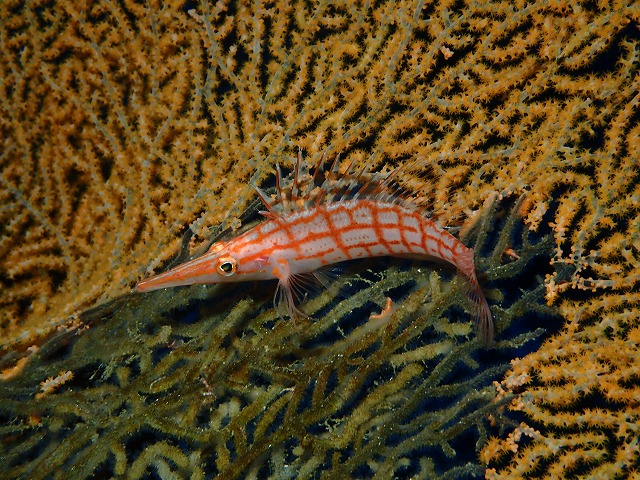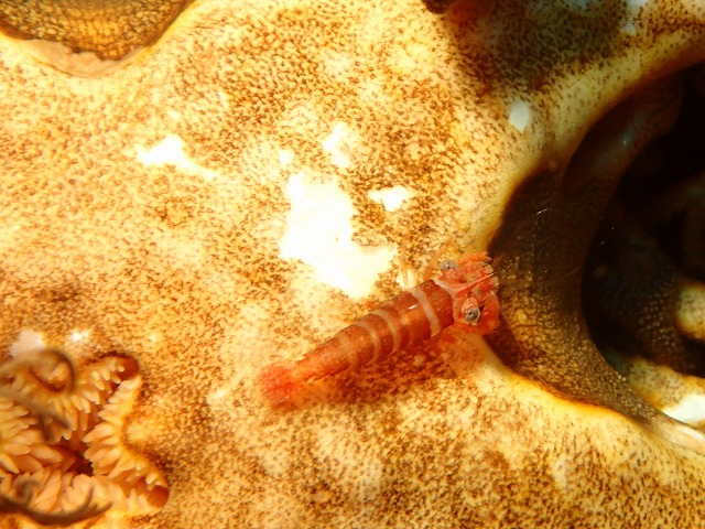 海況の方はまだ少しうねりは残っていて潮が挙げてくる時間帯はたまに大きめのうねりもありました。それ以外の時は割と穏やかな感じでしたね。透視度も少しもやっとしていて15~25m位です。そんな今日は久しぶりにブリマチの深場へ行ってきましたサクラダイやスジハナダイなどに混ざってナガハナダイも見られました。きれいなハナダイでした。そして、ここにもクダゴンベの姿がありました。昨年から数が多いですね。いろんなところで見れています。目的のものは見られませんでしたが久々に行けてよかったです。帰りにはバディーがテヅルモヅルカクレエビを教えてくれました。うねうねと動く触腕の中でじっとしたエビちゃんでした。なかなか綺麗でしたね~。入江では今日も温水エリアでキビナゴにまかれてきました。ここは温水が出ているのでサーモクラインがものすごく写真を撮ろうにももやもやしちゃいます。少し外れたところに動いてようやく撮れますね。なかなか数がすごいので圧巻です。しばらく西風予報なので良い海況が続きそうです。是非潜りに来てくださいね~。