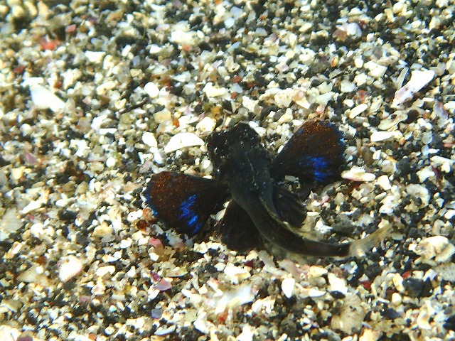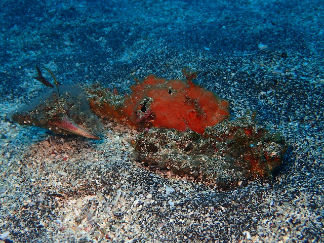 海況ですが南西の風が強く沖がかなり波立っていてうねりも少しづつ回り込んでいました。エントリーエリアもうねりの影響が結構出ていました。そして浅場もしっかり揺れていましたね。今日は砂地をメインに回ってきました。揺れも砂地まで降りるとほとんどなくなって快適でした。潜降してすぐにタカベの子供の群れに囲まれました。この時期ならではの光景です。キラキラして綺麗ですよ~。かけあがりではイシモチが川のように見れています。これも圧巻ですね。砂地では久しぶりにヒシガニを見ました。大きくて迫力満点ですが写真はちょっと地味になっちゃいますねぇ。先日見つかったセトミノカサゴも同じところに居てくれました。そしてじっくりと砂地を回っているとホウボウの赤ちゃんが見つかりました。ようやく見つかりましたね~。まだ真っ黒ですがヒレを広げると青い色がしっかり出てきてきれいです。今季初の子でした。そしてレア物(笑)のベニカエルも2匹定位置にいてくれます。そしてもう1匹も見つかっているようなので3匹は出ているようです。大事に見ていきましょう。今日も水温17℃、透視度も砂地のエリアで20mは見えていて青くて綺麗です。いい海です~。
