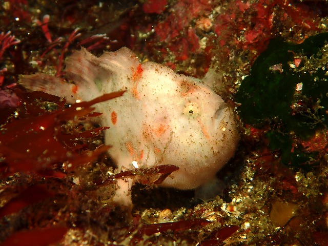 海況の方はうねりもあまりなく穏やかでした。出入りもストレスなく良い感じです。透視度の方が少し落ちちゃいましたね。浅場でも5m位でした。深場では15m位は見えています。潮自体は青い感じだったので春濁りな感じではなさそうですね。最近は日替わりなので今後良くなってくると思います。さて、今日は一の根周りをのんびりとまわってきました。近場のベニカエルが今日はお出かけ中の様で見れませんでした。深場のほうのはちゃんといてくれましたね。あいかわらずお腹がポンポコリンです(笑)また、サガミリュウグウが今までと全く違うところで見れました。2匹目なのか動いたのかどっちなんでしょうか。入江ではショウジンガニのメガロパ幼生が大量発生中です。今日もたくさん見れました。こちらも期間限定です。今のうちですね~。さて、明日からいよいよゴールデンウィークですね!!4日以外はまだ空きがありますのでドタ参大歓迎ですのでよろしくお願いします。