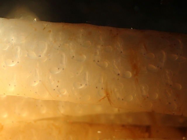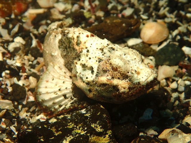 海況の方はうねりはまだ少し残りましたが概ね良好す。透視度は全体的に白っぽくもやもやした感じで浅場が8m位、深場へ行くと15m位見えてきましす。こちらもまずまずですかね。昨日までの時化で先日登場したアマミスズメダイが心配で見に行ってきましたが無事にいてくれました~。飛ばされてなくてよかった!!砂地では以前見つけたケンサキイカの卵を見てきました。こちらはかなり成長してきていて眼もはっきり分かるようになってきました。ハッチアウトまではもう少しですかね。もう少し観察できそうです。そして今日は新顔が!!黒のイロカエルアンコウが登場しました!!サイズも立派でコブシくらいある大きな子です。長く見れるといいですね~。でもサイズ的には動いちゃうかな。入江では白っぽいサツマカサゴを久しぶりに見ました。じっとしていて全く動かなかったですね~。さて、水温も17~18℃と暖かくなってきました。明日以降気温も上がってくるようなので快適ダイビングになりそうです。是非潜りに来てくださいね~。お待ちしています!!