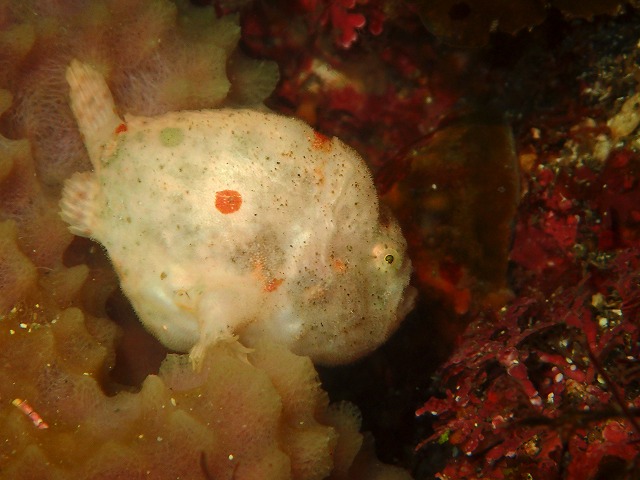 海況の方は今日も穏やか、ベタ凪です。出入りもストレスなくできていい感じです。透視度の方は変わらず5m程度。昨日よりもちょっと暗かったですね~。とは言えマクロに集中すれば透視度も関係ないです。今日も小さい物探しをしてきました。白いベニカエルは今日も定位置にいてくれました。今日は全身丸見えでおなかがポンポコリンでまん丸くなってました。食事にありつけたんですね~。ハナタツもいつもの場所にいてくれました。浅場ではハナキンチャクフグをも見に行ったらなんとその場所にポストが設置されていました。びっくり!!体験ダイビングの方も投函ができるようになったんですね~。そしてハナキンは・・・。奥では久しぶりにミスガイが見れました。立派なサイズでしたね。眼もくっきりです。さて、明日は初島に行ってきます。きれいな潮が来てないかな~。週明けも空いてますので潜りに来てくださいね~。
