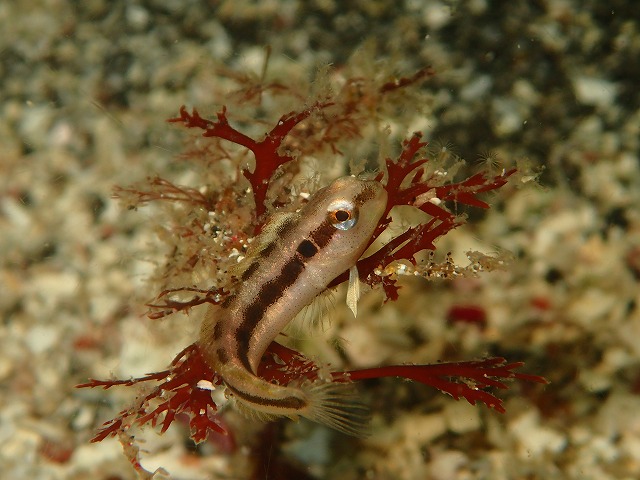 海況の方もならいの風が吹いて風波が出てきました。それほど強い感じではなかったのすが昼の干潮時には出入りがちょっとめんどくさかったですね~。水温は22℃をキープしています。透視度は5mでちょっと緑がかっていましたね。今日は綺麗な潮はかなり深いところにいる感じでした。なので特に近場は全体的に5mほどの透視度でした。かけあがりのネンブツダイの群れは卵をもったオスがかなり多くなってきました。うまくタイミングを見て産卵みたいですね~。また、黄色いハナタツも今までよりもかなり離れた場所で抱卵しています。ここから動かないでほしいですね。そして卵つながりで砂地では新しいケンサキイカの卵が2箇所見つかりました。まだ生みたてで真っ白い卵です。まだ産んでるんですね~。アオリイカの産卵床も入ったのでこちらも期待しましょう~。さて、明日からの週末日曜日がガラガラです。ドタ参大歓迎ですのでぜひお越しください~。お待ちしています!!