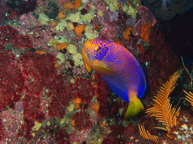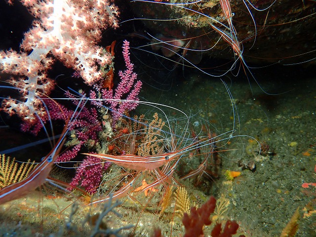 うねりも時間とともにちょっとづつ大きくなってきた感じでした。出入りもタイミング見てでしたね~。そんな中は行ってみるとなんと水が綺麗になっていました!!先日までの暗く濁った潮はなく青くて綺麗な潮に入れ替わっていました。まだ巻き上がりでもやっとした感じはあるものの浅場でも10mは見えています。降りていけば20mは見えていましたね。いや~、ほんとに良く見えました!!調子に乗って今日は5番まで遠征しちゃいました(笑)超久々の5番でしたがやっぱり水がいいと綺麗ですね~。アジやタカベ、キンギョの群れがやばかったです。大きなホウキハタも居ました。さらにこちらも久々のオキノスジエビも変わらず群れ群れでした。産卵期ですね。たくさん抱卵した子がいました。レンテンヤッコとかも久しぶりに見ましたねぇ。久しぶりの5番はやばかったです。砂地ではウミテングもかわらずいてくれました。今日はあまり動かず前回と同じとこでしたね。その他ハナタツやベニなども定位置で見れました。それにしても潮が綺麗って本当に素晴らしいですね~。これで春濁りも終わってほしいです!!と言う訳で6月7月大募集中です。7月はサンセットやナイトもありますのでぜひお越しください。よろしくお願いします~。