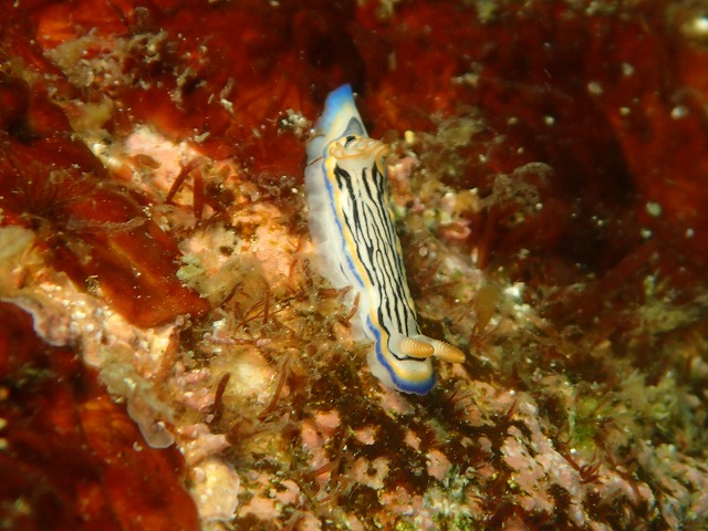 浅場が5mくらいでモヤ~としていました。深場に降りると綺麗な潮も出てきてそこへ行くと15m以上は見えています。ちょっと冷たい潮ですが・・・。そんな中今日もがっつり3ダイブ楽しんできました。砂地ではウミテングが2匹居るんですが今日はビミョーに離れていてくっついてくれませんでした。喧嘩でもしたかな・・。アカオビハナダイは元気に泳ぎまくっていました。何やらパクパク食べてましたね~。一の根のハナタツも定位置でみれました。近くでは真っ赤な子も居てくれましたね。午前中は一緒に並んでいたようです。そしてこんなもやっとした中でもタカベの群れやキンギョの群れ、ワラサなどが見れました。もう少しすっきりしてくれると中層も楽しいですね~。さて、ここ最近は南方種の赤ちゃんが続々と入って来ています。まだまだ見つかりそうです!!この子たちの成長をぜひ見に来てください~。
