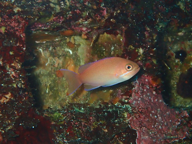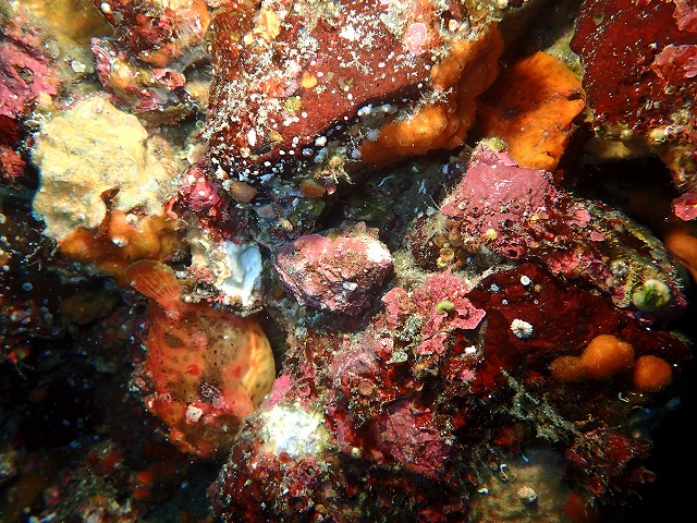 そんな中ウミテングがまたまた大移動。ほんとに良く動く子です。見つけるのに一苦労です。かけ上がりに行くと今日もタカベリバーが見られました。いつみても綺麗ですが突然やってくるのでカメラが追い付かないです・・・。岩部ではカエルアンコウのペアが見れています。写真の右上の亀裂と左下にそれぞれいるのが分かりますか~。上がオス、下がメスです。