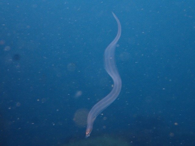 そして入江でツユベラを見てるとそばで人だかりができていたので混ざってみました。みんなのカメラの先にはレプトセファルスというアナゴやらウツボやらの赤ちゃんが!!良く動くのでこれが限界です。いや~最後にいいもの見ました(笑)