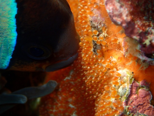 昨日産卵を確認したクマノミペアも一生懸命世話をしていました。少しづつ成長してますね~。浅場ではシロタスキベラの赤ちゃんが見られました。ベラも増えてきましたね~。そしてサザナミヤッコも登場です。まだ小さくてかわいいです。