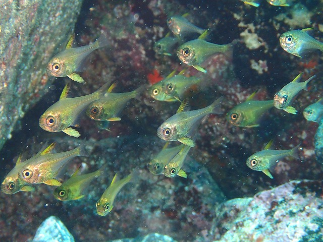 壁沿いのイシモチの群れはさらに増えていい感じになっています。とってもきれいですよ~。入江のハタンポの赤ちゃんもスケスケでいいですね~。全体的にそれほど荒れていない感じでホッとしています。これからさらに海の中は落ち着いてくると思います。そうなるといろいろ出てきて面白くなってきますね~。これからが楽しみです!!