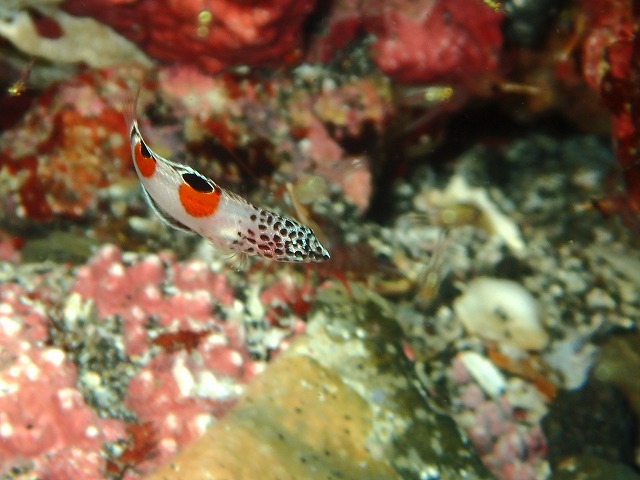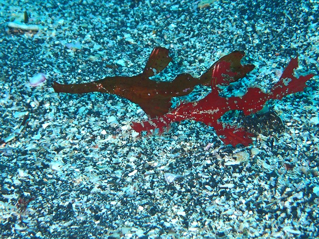 今日は砂地を中心に回ってきました。ポストは昨日無事を確認しましたが今日は産卵床を探してみました。先日まであった場所へ行ってみると2つとも影も形もありません。ちょっと下へ落としても影も見えませんでした。これはかなり沖へもってかれた感じでした。残念です。砂地の帰りにはカミソリウオのペアが見られました。先日まで見ていたのとは違う子のようですね。ペアで流れてきたのかな~。さらにいいサイズのカンパチの群れにも囲まれました。これはテンション上がりましたね~。圧巻でした。棚上ではタキゲンロクダイのチビちゃんがカイメンに隠れていました。この子たちも来たんですね~。これからもっともっと南方種が増えていきますね!!