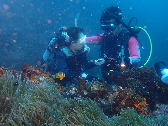 そんな今日は昨日からのOW、リフレッシュ、ファンダイブと盛りだくさんでした。皆さんこの海況でもしっかり潜れていました。特に海洋実習1日目のご夫婦は1本目はちょっとあわあわしちゃいましたがスキルも無事終了できました。浮力コントロールもばっちりでしたねぇ。