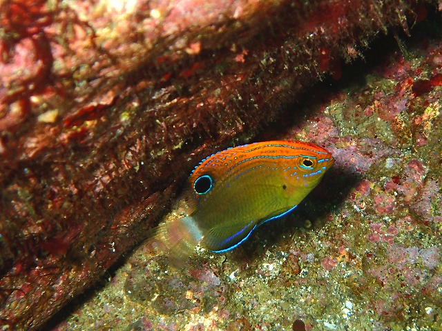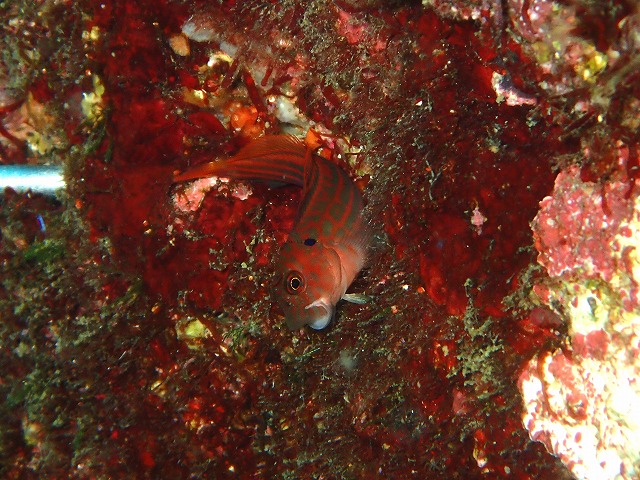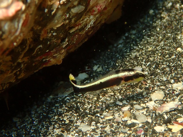 そんな中今日は久しぶりに左際をじっくりと回ってきました。移動してちょっと行くと仲間にスジタテガミカエルウオを教えてもらいました。なかなか立派なサイズで綺麗でしたね~。そして巨大化したアマミスズメダイ(笑)も健在でした。そして今までいるいると聞いていたクロメガネスズメダイもようやく確認できました。メガネに比べて明るい色合いでいいですね~。コロダイの赤ちゃんも見つかりました。浅場はしっかり揺れていましたがメガネスズメダイも定位置でした。お目当ての子はいませんでしたが左も面白くなってきましたね~。