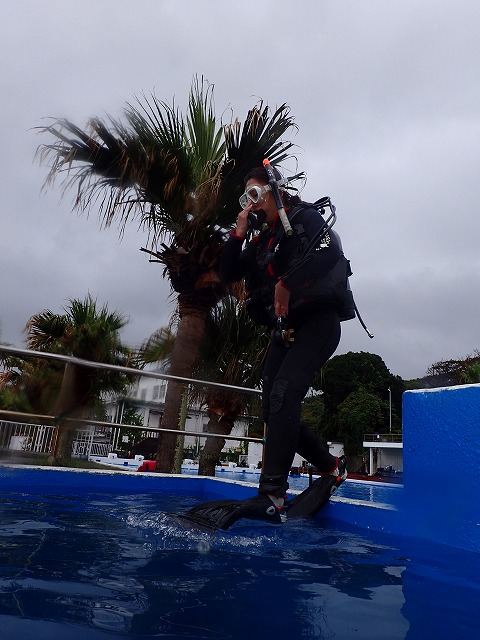 こんにちは~。今日も朝から雨でしたね。そんな今日から3連休がスタートしました。そして今日からOW講習もスタートしました!!まずはプール講習です。うねりのあるIOPの海を横目にベタ凪のプール!!連休のせいかプール賑わっていました。今回ご参加の方は西と東とそれぞれからいらしていただきました。