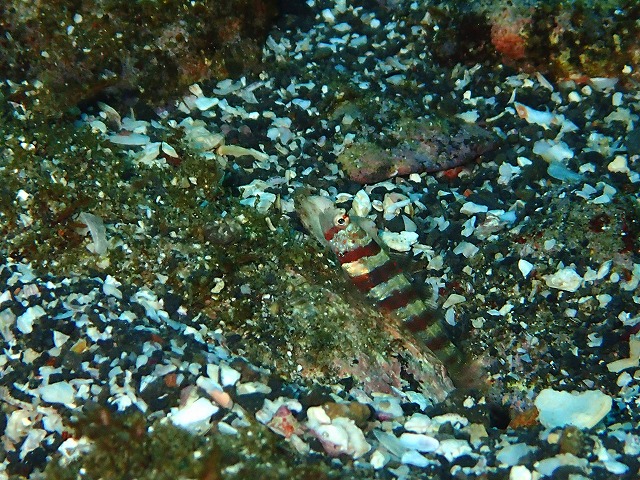 根周りは昨日見つけたフタスジタマガシラやタテジマキンチャクダイが同じ場所にちゃんといてくれました。またクロメガネ、メガネ、ミヤコキセンなどの各スズメダイたちも変わらずいてくれました。さらにクビアカハゼも登場しました。まだ小さい子ですがどんどん成長してほしいですね~。共生ハゼはやっぱりコシジロテッポウエビでした~。