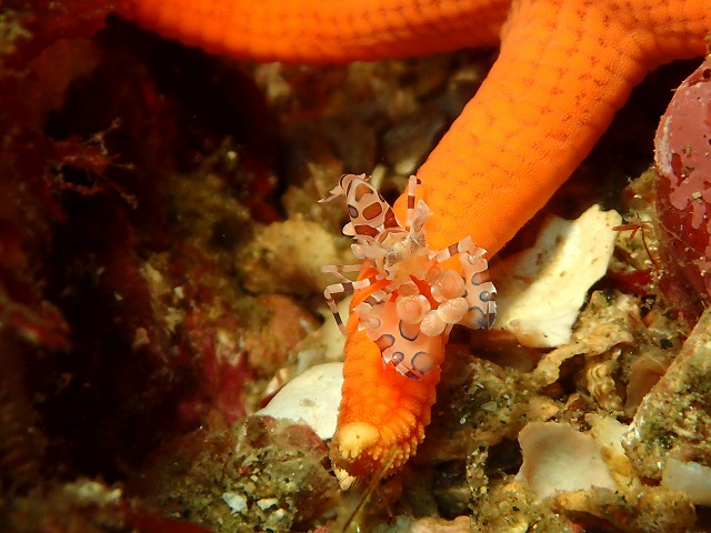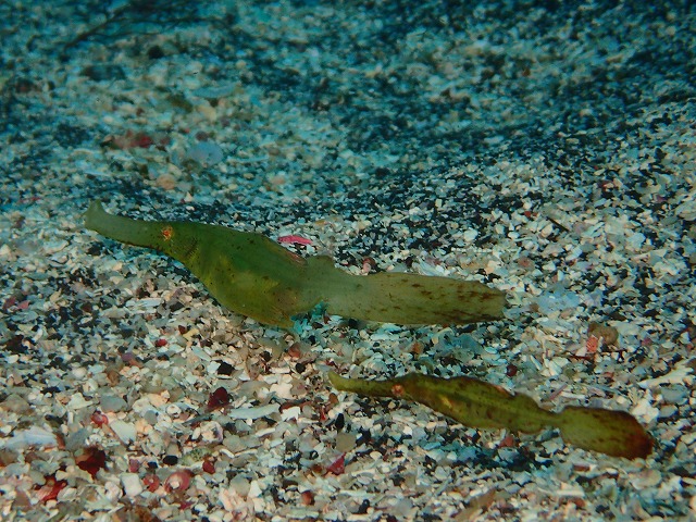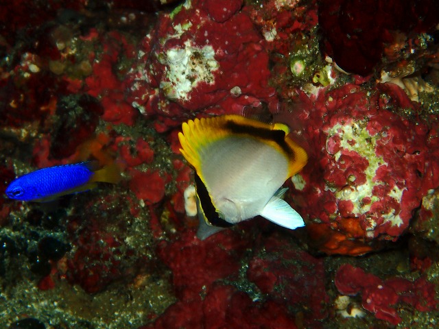 午前中はとにかく潮が青くてキビナゴやイワシの群れがかなり多く見られましたね。めちゃくちゃ綺麗でした。心配だった砂地のカミソリのペアやフリソデエビも無事に定位置にいてくれました。また、根周りのテングチョウや赤いカミソリ、アブラヤッコ等も見られてかなり収穫もありましたね~。