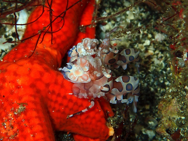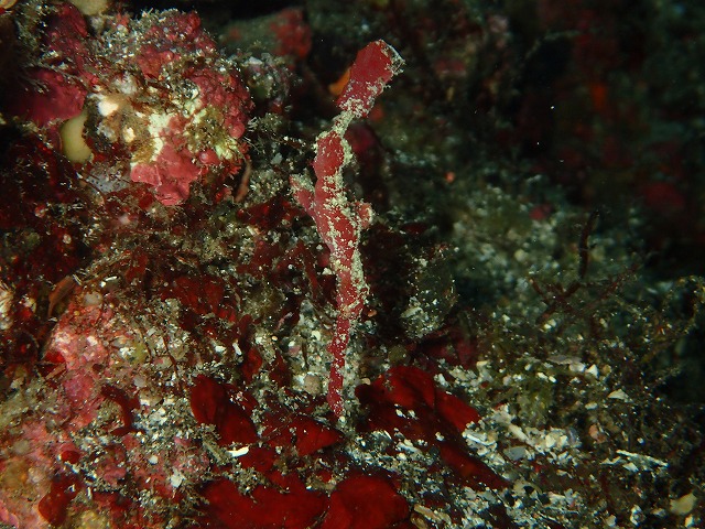 先日見つかったフリソデペア、周りの荒れ具合も含めて心配でしたがとりあえずは無事に確認できました。ペアの片割れはハサミが片方しかないですね。それでも元気にヒトデを食べてます。クエ穴の下では今日も大きなクエがクリーニング中。気持ちよさそうでしたね~。都近くのカミソリウオも健在でした。