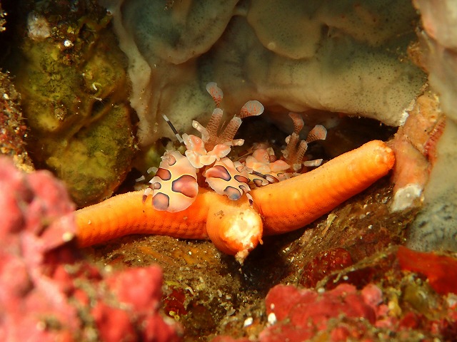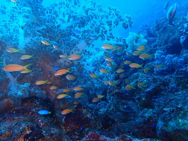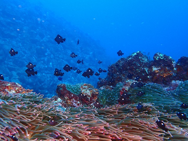 水面にはメジナがたくさん群れて居ましたね。キビナゴも中層で群れ群れでカンパチも突っ込んでいました。2番ではキンギョのメガ群れやイサキやスズメダイも良い感じに群れて居ます。そして久しぶりにクダゴンベも見れました。小さくてちょろちょろ動く元気な子でしたね。1の根ではクマノミ城にいるミツボシがなんだか大きくなっていて群れが見ごたえありました。フリソデも健在です。ヒトデをしっかりと抑え込んでましたね~。入江のカンムリベラとかも大きくなっていてもうすぐ次のステージが見られそうな感じ。しっかり成長して越冬してほしいです。