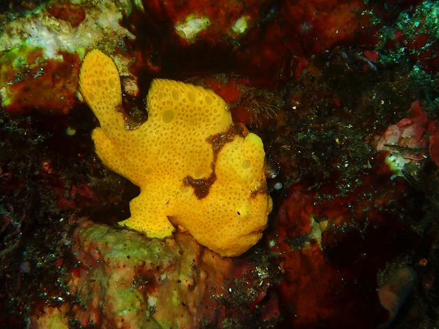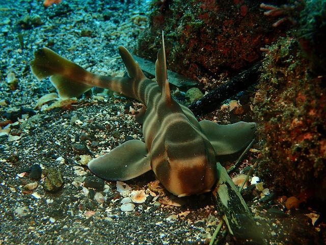 根周りではイロカエルやベニカエル、フリソデが変わらず見れています。すぐにいなくならずにいい子たちです。そして浅場ではネコザメの赤ちゃんも居ました。以前見ていた卵から出てきた感じでちょっと感慨深いです。おなかがぽてっとしてました(笑)