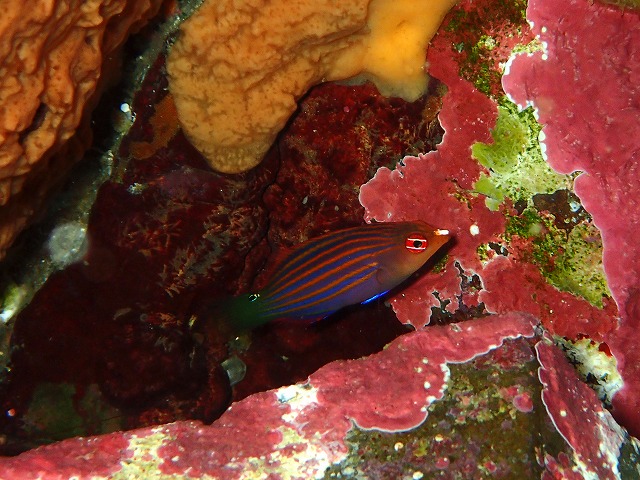 さえ今日は久しぶりに1.5番を下から回ってみました。いつものフリソデも定位置でしたがそれぞれがヒトデを抱えていてなんだか別居状態になってました。砂地では綺麗な砂イソギンチャクにマルガザミがついていました。きれいなエビちゃんとか期待しましたが・・・。かけ上がりを見ていくと小ぶりなソメワケヤッコが居ました。この子がかなりナーバスですぐに引っこんじゃってなかなか撮れませんでした。イロケロも無事に見つかりましたが見ている最中も動きまくっていて難易度の高さを見せつけていました(笑)