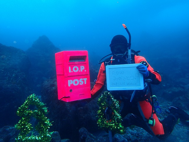 そんな今日はアドバンス講習の2日目でした。このうねりでも講習生の方は面白いといって普通に出入りしてました(笑)素晴らしいですね~。とても上手に出入りしてました。ディープダイビングもストレスなく行けましたね。潮も綺麗で良かったです。ラストダイブはツリーで記念写真!!水中ポストにも投函してきました。