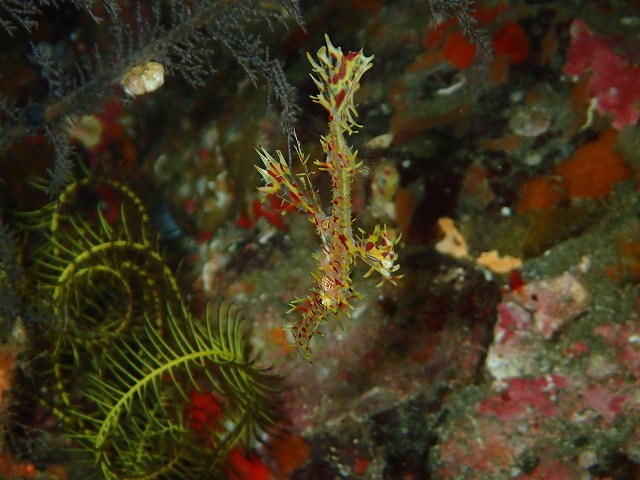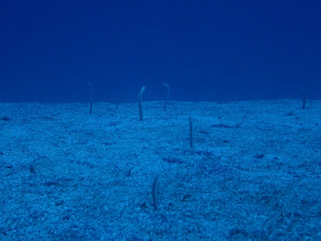 これだけ良い条件なので今日は2番へがっつり泳いできました。水面を泳いでいると表層にナミノハナの群れが集まっていました。かなりのかずで川のように流れていました。2番ではニシキフウライやイロカエルを見てきました。かなり長く観察できていますね。今日もかわいかったです。2本目は砂地でしたがポストやツリーで記念写真でした!!探し物は残念ながら見つからずでしたがガーデンイールやキリンミノが見れました。潮も青くて綺麗なのでアキアナゴもかなり良く見えました!!